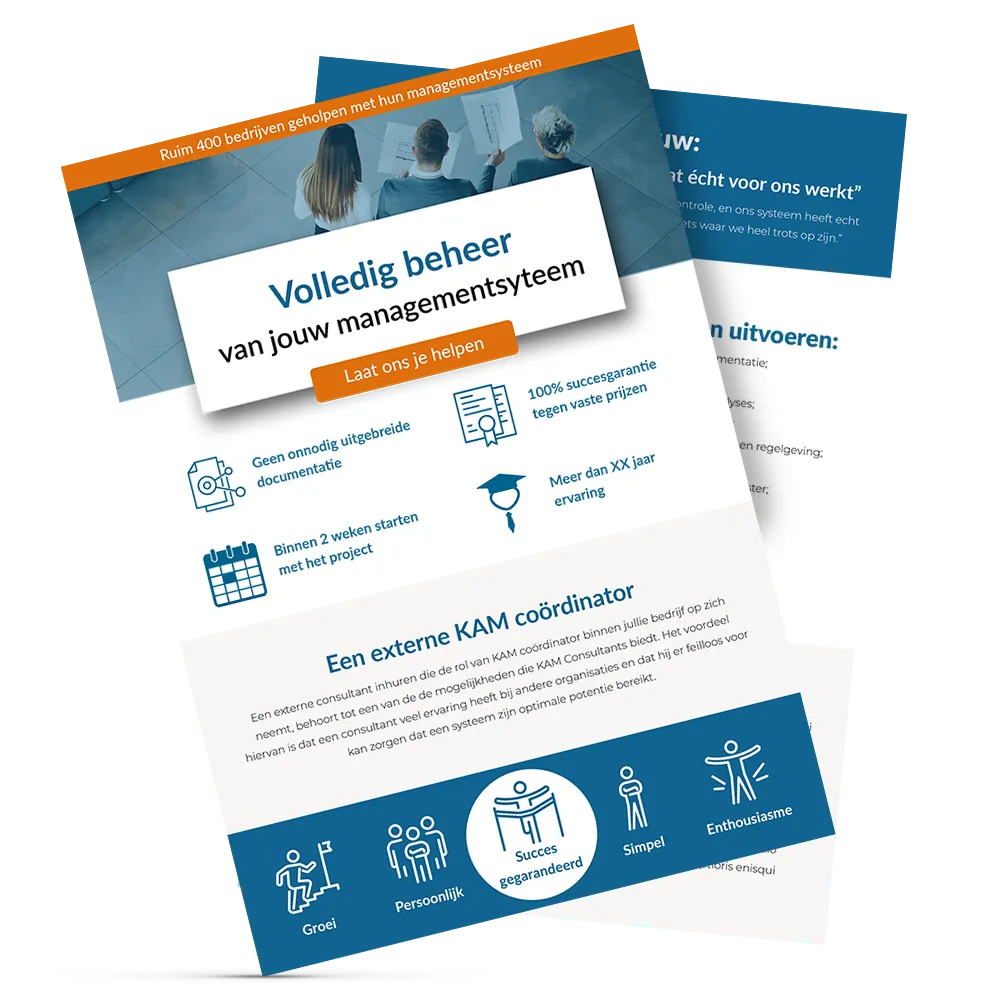 Geen onnodige documentatie en een systeem dat écht werkt. Door de ervaringen van onze consultants in meerdere branches en normen gaan zij zeer efficiënt te werk. De investering in een externe KAM coördinator hoeft niet groot te zijn: wij streven ernaar om het systeem zijn werk te laten doen voor de organisatie, in plaats van andersom.